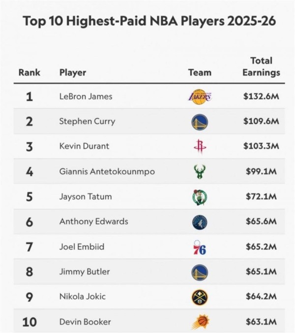 在2025-26赛季,NBA收入前十的球员预计总收入达到创纪录的8亿美元左右。 这个数字在五年前还难以想象。 随着球员个人品牌价值的不断提升,以及联盟商业开发的深入,未来可能会有更多球员加入“亿元收入俱乐部”。