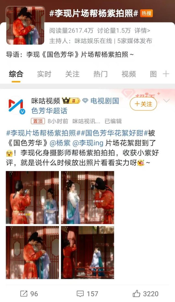 这一幕被片场的工作人员秘密录下,并迅速在网上广泛传播,引发了网友们的热烈讨论。一些网友表示:“李现和杨紫真的太甜蜜了,这简直是《亲爱的,热爱的》的现实版延续!”还有一些网友调侃道:“李现这是想把杨紫拍成最美的国色天香吗?期待成品!”
