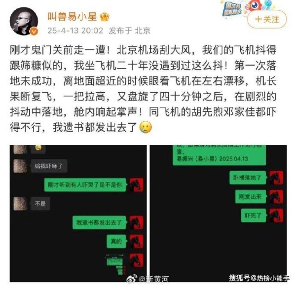 4月13日,导演易小星在微博发文讲述与演员胡先煦、邓家佳同乘航班遭遇极端天气的经历。文中提到,飞机首次降落时因大风偏离跑道,机长果断复飞并盘旋40分钟后,在剧烈颠簸中强行着陆。易小星坦言“吓到发遗书”,胡先煦评论“感谢机组,大家出行注意安全”,邓家佳则淡定回应“我还行”。这场空中惊魂引发网友对航空安全的讨论,也撕开了明星面对危机的众生相。