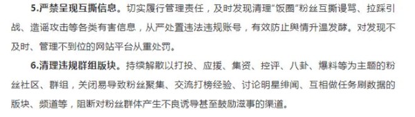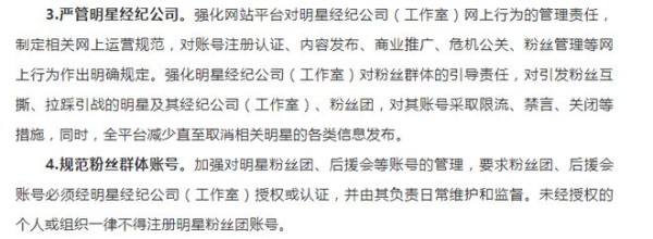 这一条明确了粉丝管理的第一责任人在于艺人及团队:强化明星经纪公司(工作室)对粉丝群体的引导责任,对引发粉丝互撕、拉踩引战的明星及其经纪公司(工作室)、粉丝团,对其账号采取限流、禁言、关闭等措施,同时,全平台减少直至取消相关明星的各类信息发布。