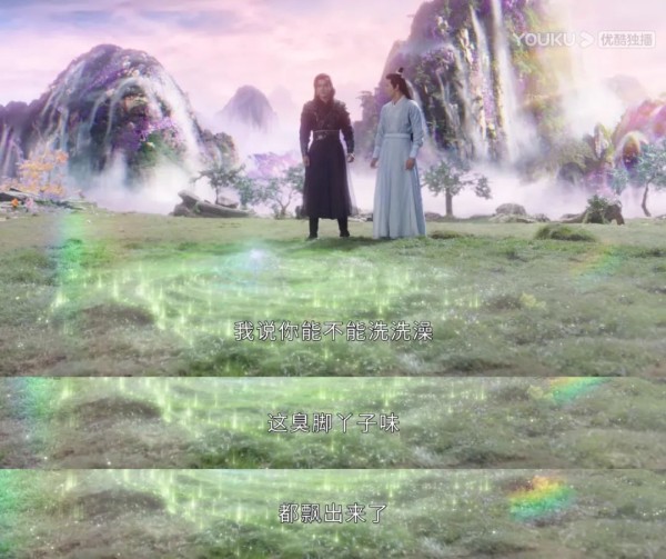 但在打破仙恋唯美方面,它却是各部门齐上阵、一条道走到黑。男一在臭水沟里捞铜板,男二反复被cue不洗脚,男三闻袜子寻人……为了搞笑,编剧设计了太多屎尿屁梗,根本不管在二次元文化里长大的观众受不受得了(众所周知,纸片人不上厕所,非ABO没有体味)。