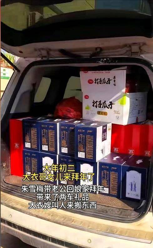 现场画面后来流出来,礼品全都在车里,奶箱、火腿肠、红袋子,一箱箱搬进院,搬得手忙脚乱。