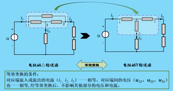 两种连接的电阻之间要满足:它们在端子1、2、3上及端子以外的特性相同,即它们的对应端子间的电压相同,而流入或流出对应端子的电流分别相等。其实呀,这就好比你有1千万,你这一千万可能是支票、现金、支付宝、股份等等各种形式,但是不管你是以什么形式拥有这笔钱,反正在外人眼里你就是有一千万(如果是真的就好了)。
