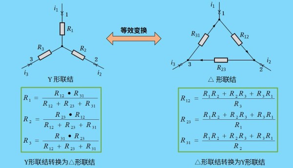 如图所示一样,我们把图左电路的结点1、2、3之间的三角形连接的电阻等效变换为图右电路1、2、3之间的星形连接的电阻。两种连接的电阻之间要满足:它们在端子1、2、3上及端子以外的特性相同,即它们的对应端子间的电压相同,而流入或流出对应端子的电流分别相等。