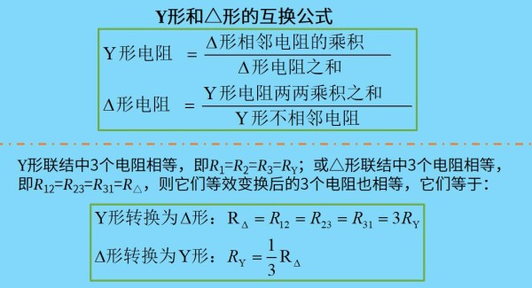 为了大家的方便记忆,我们把图10-2中的表达式用文字归纳得到下图10-3的式子。另外,当用于等效变换的三个电阻(Y形或△形)相等时,它们等效变换后的三个电阻(△形或Y形)也相等。