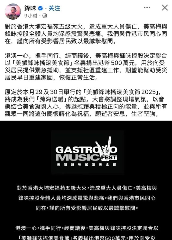 你们知道吗,就在11月29日那天晚上,澳门美高梅那个灯火通明的舞台上,谢霆锋本来是在参加“美狮锋味摇滚美食节”的演出。 可他一上台,第一句话说的不是音乐也不是美食,而是香港大埔宏福苑那场让人心痛的大火。