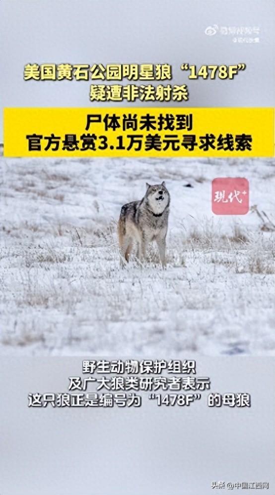 近日,美国野生动物专家称,黄石公园最著名的狼群中一只知名狼,上月疑似在公园外围遭非法射杀。当地官员虽未透露被杀害的狼的具体身份,但野生动物保护组织及广大狼类研究者表示,他们确信这只狼正是编号为“1478F”的母狼。
