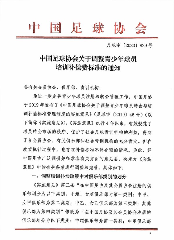 中国足协近日发布了一则关于调整青少年球员培训补偿费标准的通知,引起了广泛关注和热议。根据通知内容,足协决定根据市场实际情况,大幅降低了青少年球员转会时的青训补偿费计算标准。这一政策调整对于俱乐部、青训机构以及青少年球员来说,无疑是一次重大的变革。足球转会市场一直以来都备受关注,尤其是对于青少年球员的培养和转会问题更是备受关注。过去几年中,中国足协发布了一系列关于青少年球员培训补偿费的管理制度,以规范球员转会市场的秩序,保护青训机构的利益。而这次的调整,无疑是对之前制度的一次完善和调整。首先,调整了俱乐部类别的划分。根据新的通知,只有中超俱乐部才被划分为第一类别,中甲俱乐部为第二类别,中乙俱乐部为第三类别,其他俱乐部为第四类别。这一调整的目的是更加准确地划分俱乐部的级别和实力,进一步规范转会市场。同时,也能够更好地保护中超俱乐部的培养投入和利益,鼓励俱乐部加大对青训的支持力度。