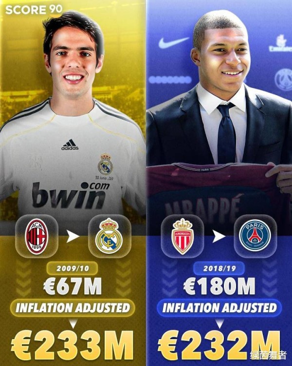 第五位的球员依旧是来自皇马。2009年,除了引入C罗之外,皇马还以6700万欧元签下了AC米兰的核心球员卡卡,通货膨胀后的身价大约为2.33亿欧元。第六名则是现任皇马球员姆巴佩,当初他的转会费为1.8亿欧元,经过通胀调整,现已达到2.32亿欧元。
