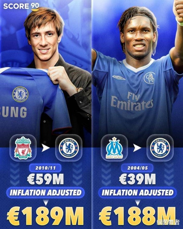 值得注意的是,排名第九和第十的球员均来自切尔西。2011年,蓝军以5900万欧元从利物浦引进的托雷斯,通货膨胀后需要花费约1.89亿欧元。而在2004年,切尔西以3900万欧元签下了德罗巴,调整后金额约为1.88亿欧元。