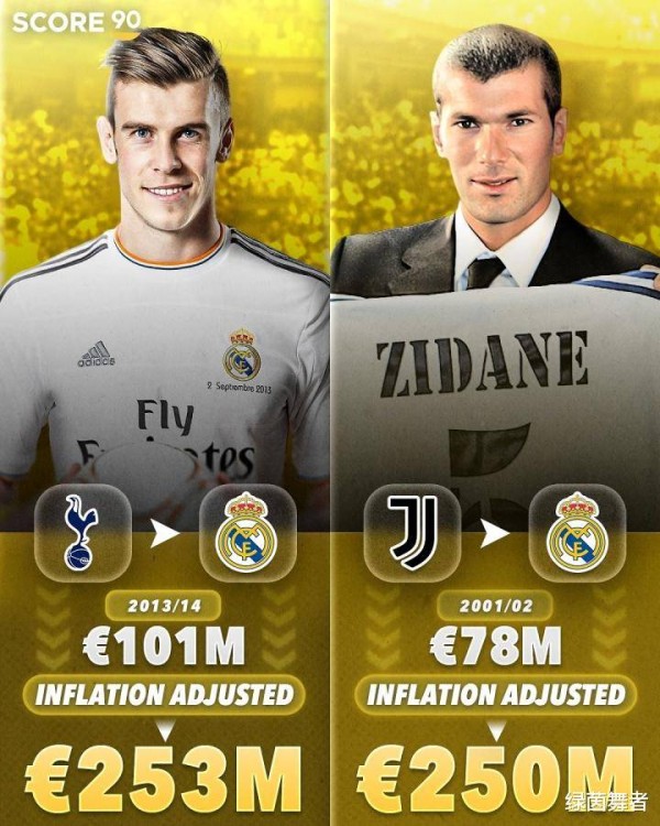 排在第三位的正是“大圣”贝尔。2013年,皇马以1.01亿欧元的价格引进了他,而在通胀调整后,这笔费用变成了2.53亿欧元。传奇球星齐达内位列第四,2001年时,银河战舰为了引进他,花费了7800万欧元;在今日看来,这个数字大约值2.5亿欧元。