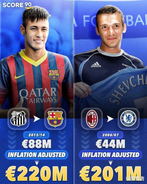 排名第七的依旧是内马尔,这一次指的是他在2013年加盟巴萨时创造的记录,当时红蓝军团花了8800万欧元,今天折算大概为2.2亿欧元。第八名则是来自乌克兰的“核弹头”舍甫琴科,切尔西在2006年以4000万欧元引入他,今天的身价大约为2.01亿欧元。