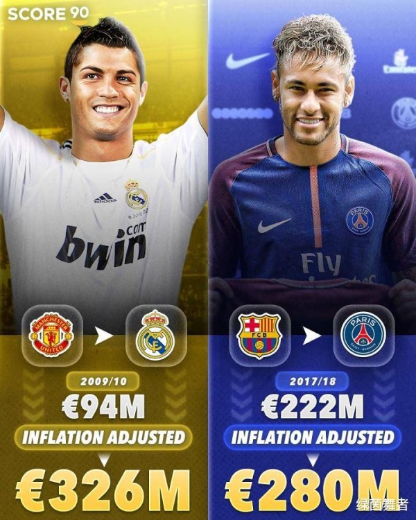 在这份榜单中,排名首位的是葡萄牙球星C罗。2009年夏天,皇马花费了9400万欧元引进这位巨星。当时的这个价格,甚至很难进入前二十,但随着通货膨胀的计算,C罗的身价瞬间飙升至3.26亿欧元,稳居所有球员榜首。