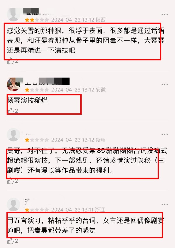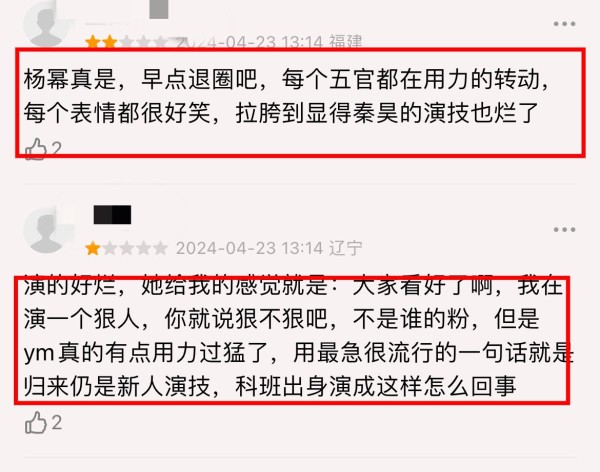抖友们普遍认为,杨幂的表演流于形式,夸张的表情,狰狞的面目,着实是用力过猛。尤其是剧中关雪教训手下扇巴掌的一幕,为了狠而狠,表演痕迹重显得格格不入。