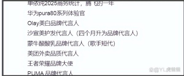 代言重合度惊人:女方今年新增多个大品牌代言,其中不少是男方曾经代言过的,甚至有个 “钢铁直男” 属性的代言被指 “和她气质完全不搭”。翻查两人的商业资源,沙宣、华为等品牌确实是两人共同的代言伙伴,不过单依纯今年凭借《歌手 2025》拿下亚军的好成绩,商业价值大幅提升,也有人辩解 “这是她凭实力挣来的”。