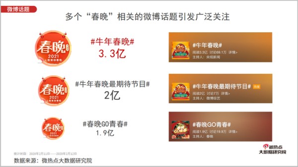 多个与春晚相关的微博话题引发广泛关注,#牛年春晚#的阅读量达3.3亿,讨论量达69.1万;#牛年春晚最期待节目晚#阅读量达2亿,讨论量达7万;#春晚GO青春#阅读量达1.9亿,讨论量达19.9万。