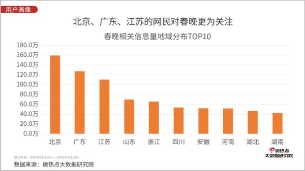 综合春晚播出时段各地网民对相关话题讨论情况可知,北京以159.48万的讨论量位居全国之首,广东、江苏省位居第二、三位,中部及东部省份的网民对今年春晚热情较高。