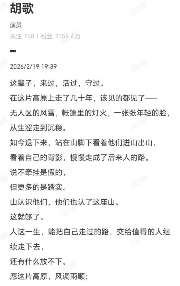 在《生命树》收官之际,胡歌在社交媒体上写下了一段感人至深的话:这座山了解他们,他们也接纳了这座山。这便足够了。人生途中,能够将自己所行的道路,托付给值得信赖的人继续前行,又有何难以割舍?他的话语温柔而有深意,仿佛在告诉大家,人生最重要的,是能够将信任与责任交给值得的人。接下来的路,虽然依然漫长,却因有了彼此的依托而不再孤单。他祝愿那片高原,永远风和日丽,愿每一位行走在这片土地上的人都能稳步前行,脚下有根。