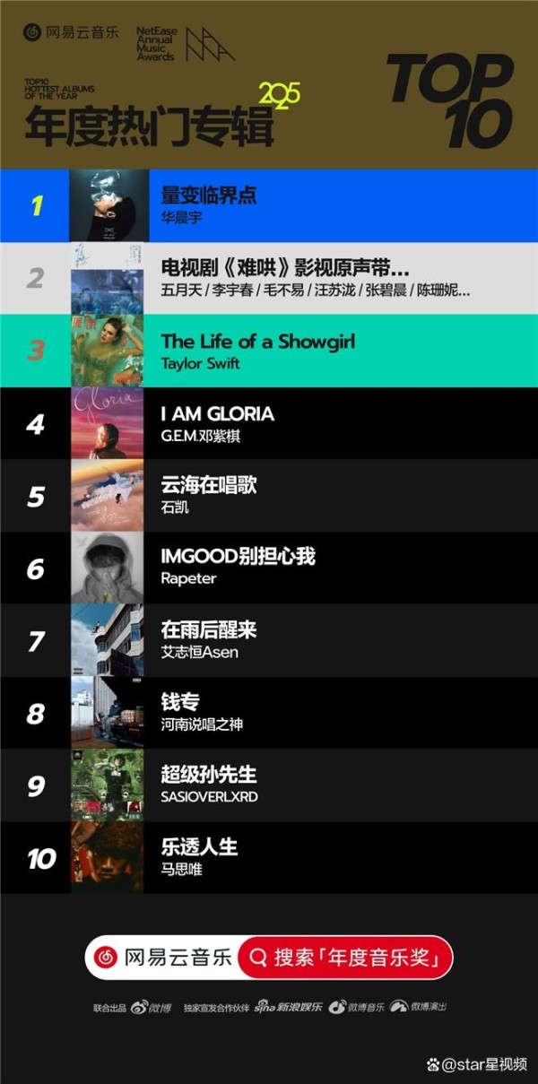 Showgirl》摘得。该专辑上线仅10天网易云音乐播放量破5000万,创下平台2025年海外艺人新专辑首日播放量最高纪录。