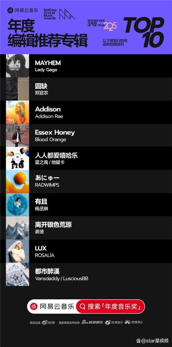 网易云音乐年度音乐奖榜单评选标准基于2025年1月1日至12月12日内网易云音乐新上架作品播放、评论、分享、红心、歌曲质量、演唱者影响力等综合数据。其中,年度畅销数字专辑、实体专辑及单曲依据实际销售排名进行评选;全民热推单曲通过网易云音乐站内新发行歌曲综合榜单全年数据排名得出。网易云音乐年度音乐奖创办于2017年,目前已成为华语乐坛极具影响力的年度音乐盛事,持续受到乐迷、音乐人等的高度认可与广泛好评。多位乐评人称赞年度音乐奖为“质量与流量均衡的榜单”。