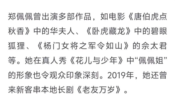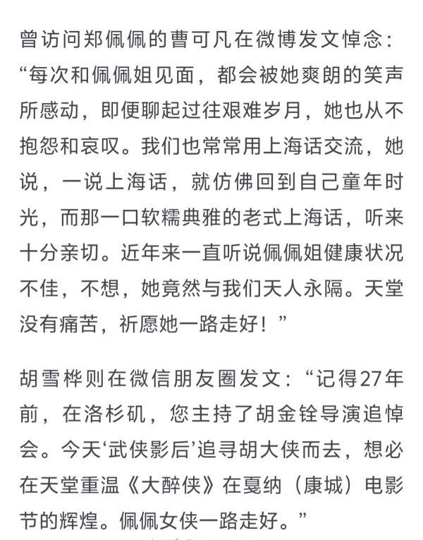 刘涛发文悼念道:“很难过,最亲爱的佩妈永远地离开了我们。她是一位善良坚毅勇敢的前辈,无论在工作还是生活中,她总是替他人着想,尽自己所能,去努力完成每一份工作,真诚照顾每一个伙伴,与她一起的日子我们也总是踏实温暖且幸福!敬爱的佩佩妈妈,很感恩这一生有缘与您相遇,永远记得您亲切地喊我‘涛啊,涛啊……’,记得您与我分享人生经历、智慧与力量,您是大家心中永远的侠女,也是我永远的知己妈妈。您最善最美最独立最坚强最真诚最大爱的样子,是我想起您时的模样,无论未来我们会在哪一个时空再见到彼此,我们依然会像之前一样拥抱彼此,谈笑人生,说一句:我想你!一直一直很想你!”