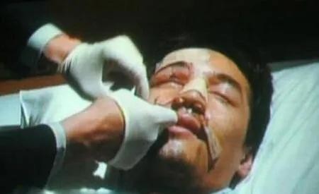 他头部受到撞击,右眼眶皮肤被撞碎。