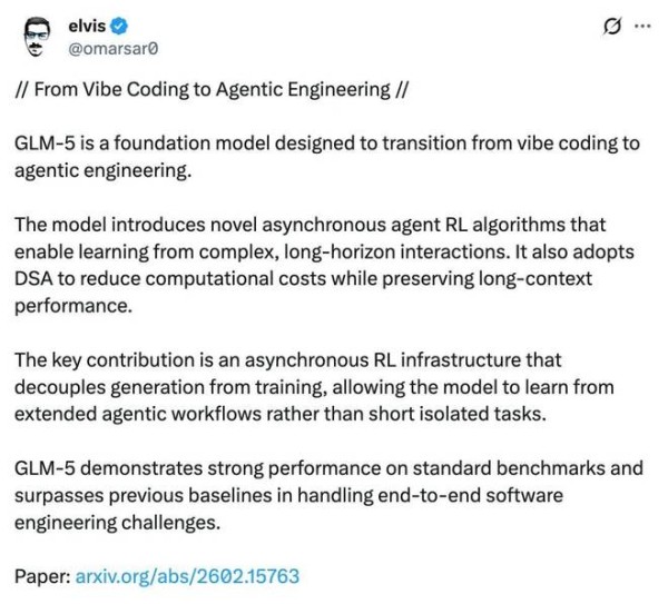 针对 GLM-5 的一系列创新,X 平台上一些大 V 给出了极高评价,「在处理端到端的软件工程挑战时,GLM-5 显著超越现有基线,标志着模型能力从『片段式响应』进化到『系统级交付』。」