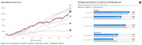 在长程规划与资源管理能力上,GLM-5 证明了其实力。如下图左的 Vending-Bench 2(让 AI 模拟自动售货机一整年)和图右的 CC-Bench-V2(智谱 AI 官方内部测试)基准结果所示,GLM-5 的表现接近并在一些任务上能够超越 Claude Opus 4.5。