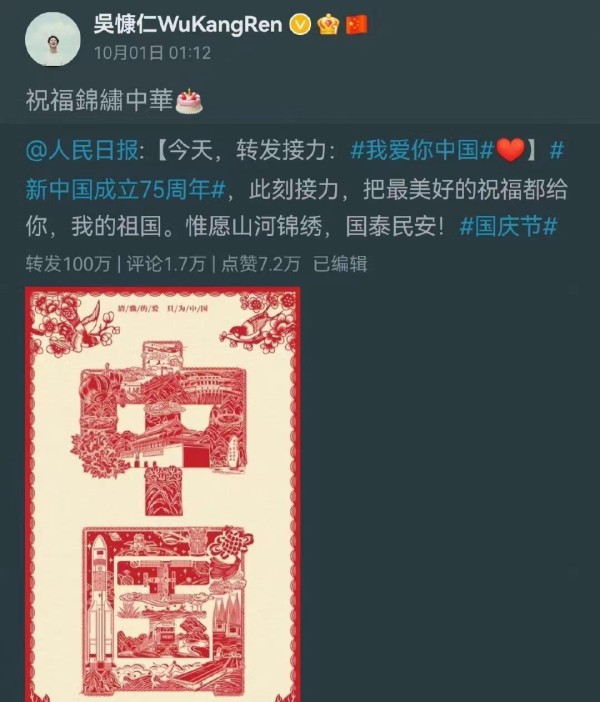吴慷仁好像是知道了事情的严重性。自从签了壹心娱乐,整个人都大变了。国庆那天,他把人民日报那条微博转发,还嘴上说说,“祝福祖国繁荣”。但这动作貌似没讨得网友好感,大家都觉着他故意显摆。这招,网友可不是那么好糊弄的。