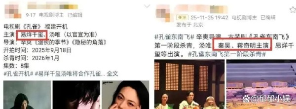 有网友顺藤摸瓜,发现极有可能是《孔雀东南飞》换角的那一次,官宣主演名单从“秦昊、易烊千玺”静悄悄变成了“秦昊、蒋启明”,一切都发生在11月底,时间点咬得很死。