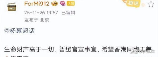 香港火灾发生,娱乐圈集体停了活动。我觉得,这不光是对生命尊严的立刻致敬,也改变了大家对明星影响力的看法。当商业活动为公共悲剧安静下来,人的关怀本身就变成了一种更深远的力量。我只能说,杨幂、檀健次、田曦薇、梓渝这些艺人做得真好。他们的粉丝也同样棒。杨幂的粉丝发起了“静候穿Prada的女王”,我觉得这是粉丝支持艺人最好的方式。