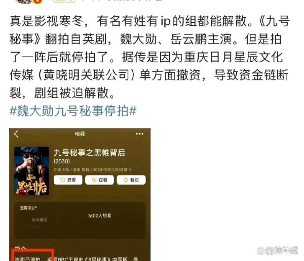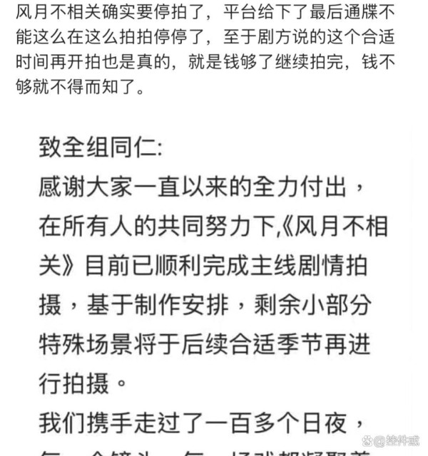 这回真的学精了。以前是流量明星闭着眼睛拍剧都有人抢,现在连资金链都要考虑成本收益。看看《九号秘事》的投资方直接撤资,《风月不相关》的"后续合适季节再拍",这潜台词简直比偶像剧还直白。以前靠"流量+IP"就能拿投资的时代,现在连顶流都撑不住了,这变化比娱乐圈的恋爱长跑还让人猝不及防。
