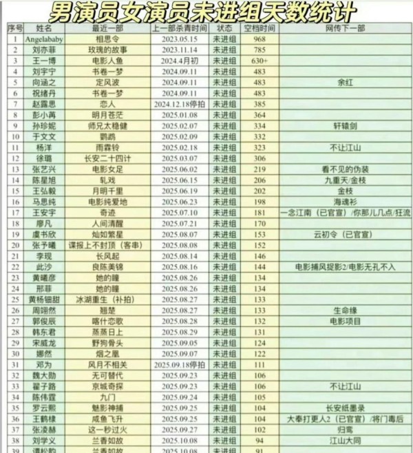 最近,一张“演员未进组天数”的统计表在网上疯传,直接把网友看懵了:杨颖、刘亦菲、王一博这三个名字赫然排在前三,空窗期统统600天起步。不是说顶流=资源拿到手软吗?怎么一转眼,全成了“待业青年”?