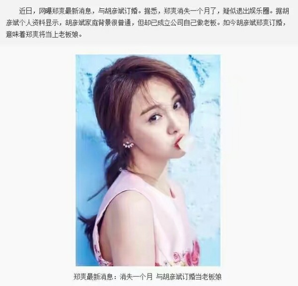 也有小道消息指出,郑爽消失是和胡彦斌结婚,但是我感觉这完全就是瞎扯的。虽然一直在传他们两个的绯闻,但是郑爽胡彦斌好像一个天上,一个底下,胡彦斌也就火过那么一两年,而且形象有限,这种人生大事,怎么可能随随便便的,这个肯定就是谣言