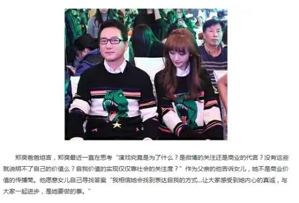 郑爸爸提到郑爽暂时隐退的原因是:到了人生的困惑期,对于自己的现状很困惑,不知道到底做这一切是为了什么?不知道拍戏是不是真正实现了自我价值,所以决定闭关,想想自己到底真的想要做什么。