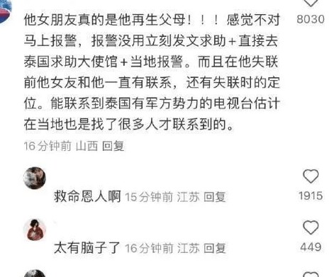 星星女友跑到泰国亲自寻找了。这一连串的行动,真的像教科书一样精准有效。她没有崩溃,也没有坐等奇迹,而是用最快的速度启动了所有能用的资源。报警、求助大使馆、联系当地警方,每一步都踩在关键点上。还有网友爆料称,同批被骗的还有许多剧组工作人员,星星的女友正是通过他们拼凑出了一些线索。她的坚持和行动,让星星的消息得以被曝光,也让他最终被找到。如果换成别人,可能早就被打击得不敢动了。一位网友感叹。两名失联女生至今无音讯,网友呼吁别让普通人消失