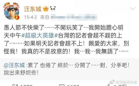 2015年的愚人节,汪东城发文称自己手分手了,还表示“说出来舒坦些”。