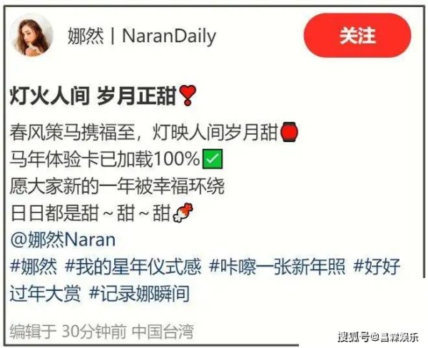 娜然的文案中还提到“阳光和爱”,这也暗示了她的幸福生活,因为阳光和爱是幸福生活的象征,而能够在新春佳节期间与家人和爱人一起出游,说明娜然的生活非常美好。