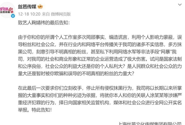 丝芭甚至公开指控鞠婧祎涉嫌严重经济犯罪,还放话如果不收手就要实名举报——这波操作很激烈。