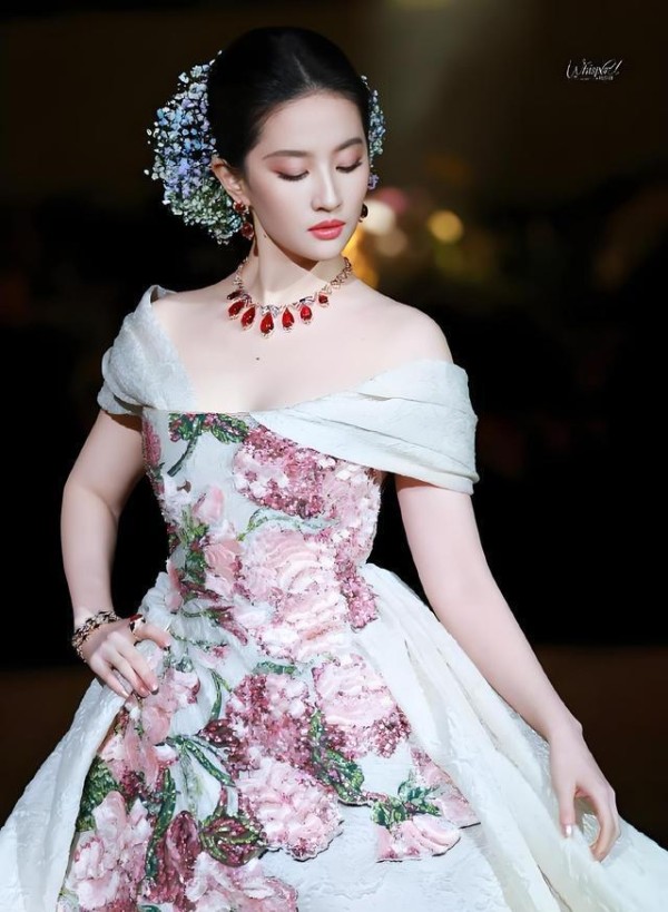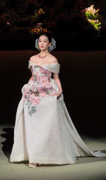 把镜头拉到舞台中央,刘亦菲的压轴亮相毫无疑问是那晚的视觉巅峰。她身着Elie Saab 2025秋冬高级定制,据说裙身手缝3000朵真花,配上复古盘发和鎏金簪花,古典与当代并存。现场给了她足足2分30秒的独享镜头,外媒甚至用“重新定义东方花仙子美学”来形容,这既是造型的胜利,也是品牌与明星联手造势的成功案例。