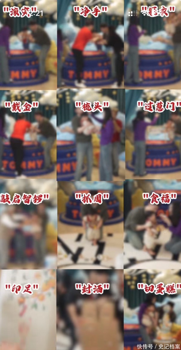 整个周岁的流程分为“滚灾、净手、冠衣、戴金、梳头、过葱门、敲启智锣、抓周、食福、印足、封酒、切蛋糕”,球球只给大家展示了重要的画面。