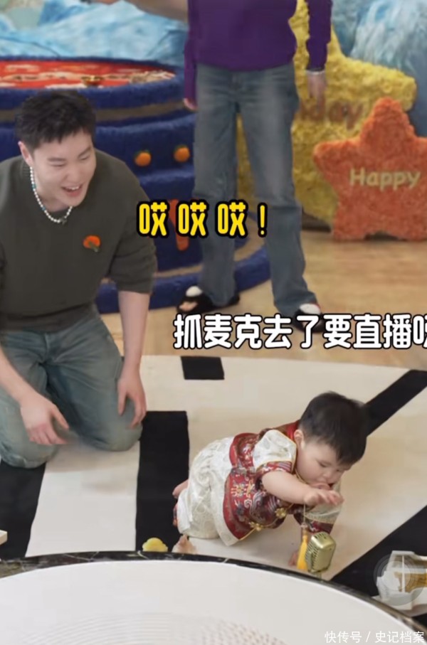 其中在抓周环节,小皮先是抓到了放大镜、随后换了宇航员、金饭碗,周围人让小皮重新抓一个,这时的他一把拿起了麦克风,而画外音赵本山调侃外孙“抓麦克去了,这是要直播啊”,引发全场哄堂大笑,主持人也调侃这是遗传了家里的基因。