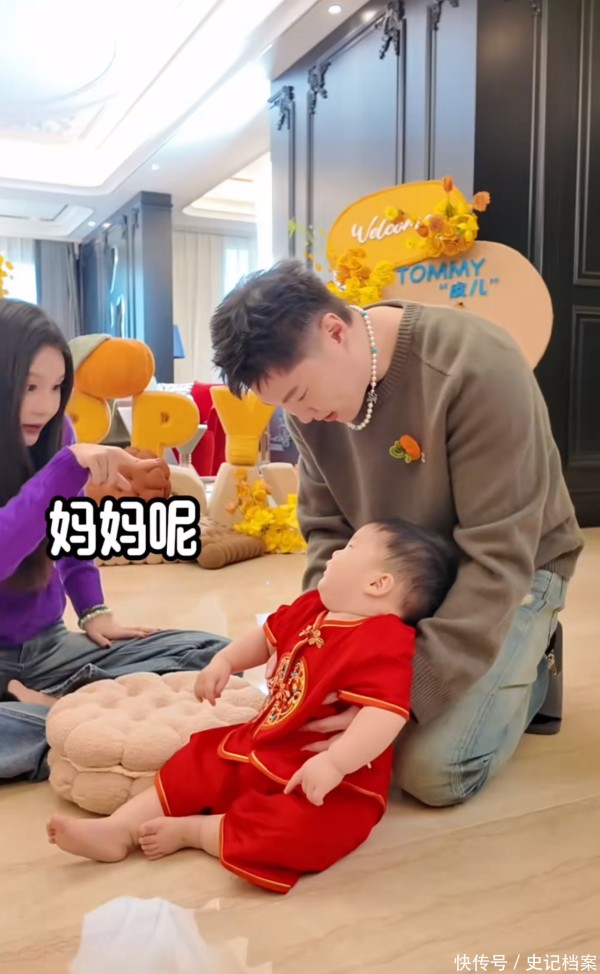 周岁礼邀请的人并不多,来的全部都是至亲好友,还找了主持人。在主持人"一岁一礼,一生欢喜,一岁一周,一生无忧"的背景音中,球球和小陈抱着儿子走进客厅。