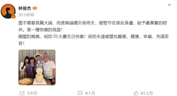 12月29日,林俊杰在社交平台甩出一张“全家福”。镜头里,他紧挨着一位年轻女孩为母亲庆生,配文一句“无论晴天或雨天,都坚守在彼此身边”,既给母亲惊喜,也把恋情彻底公开。