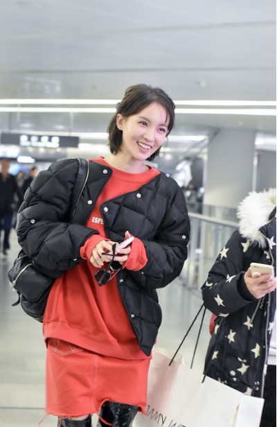 那么长款的黑色羽绒服也是不错的选择,只不过需要注意,长度一般在膝盖左右会比较好看哦。服饰本身所具有的特性,并不一定会完全体现在服饰造型中,对于很多特性,大家可以扬长避短。就像金晨这身材不是一般人,穿羽绒服还显骨感曲线,女明星里也少见,整体搭配帅气有型,黑色无领的夹克式羽绒服,很显脸小。