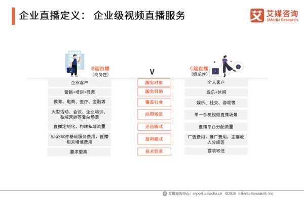 企业直播是部署在服务提供商服务器上的网络直播系统,主要为企业级用户提供视频直播服务,包括内容传播、营销获客和商业应用等形式。企业直播作为B端直播生态类型,与覆盖游戏、社交、娱乐等C端直播有所不同,其实用性、商务性更强,旨在满足教育、医疗、电商等各行业企业的营销、管理需求。