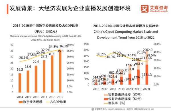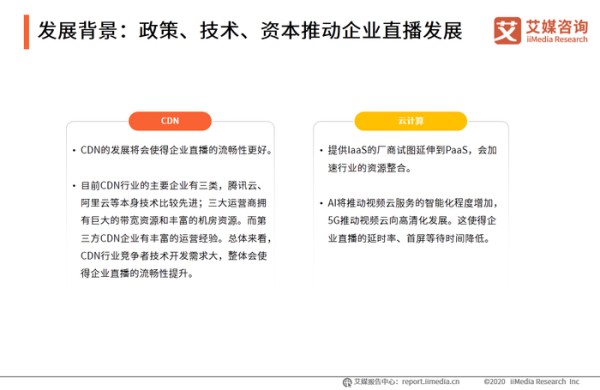 技术环境:CDN技术和云计算技术是企业直播上游两大基础性技术。CDN行业的发展将会使得直播的流畅性更好;云计算技术的发展使得用户体验更好。5G的推广使得直播的画质、信号可靠性、延迟大幅提高(例如5G+8K)。