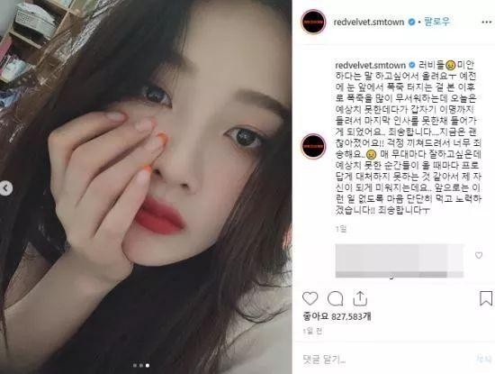 随后,JOY也在在官方INS账号发了长文表示:“真的很对不起大家”“之前有一次我亲眼看到爆竹炸开的样子,自那之后就特别怕爆竹,今天也是没有料到会有这样的情况,再加上突然出现了耳鸣,下台之前都没能好好地跟大家打声招呼,对不起”向担心的粉丝解释当时的状况以及自己对爆竹的恐惧。