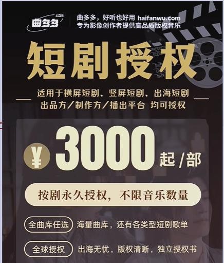 2025年年中,针对竖屏短剧制作方的音乐授权需求,曲多多依据市场供需情况及对潜在客户预算的深入调研,推出了仅需3000元/部的优惠价格。这一举措旨在为短剧制作方提供性价比极高的音乐解决方案,助力他们更高效地完成项目制作。