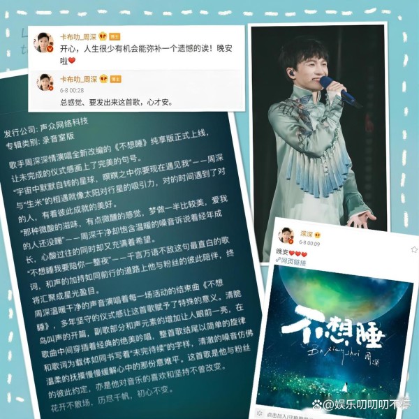 但,事与愿违,周深未能完成心愿,粉丝也没能在歌手听到期待已久的《不想睡》。但是没想到,不久之后,他竟然买了版权,录出了这首十年粉丝安可曲。周深,他只是为了弥补粉丝的缺憾,表达对粉丝的回应,《末日飞船》五语版告白如此、《有可能的夜晚》如此、相思版《秦淮景》如此、《monster》 亦是如此……